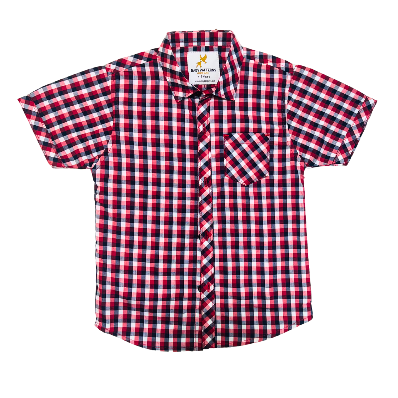Add a pop of color to your child’s wardrobe with this vibrant short-sleeve check shirt from Baby Patterns. Crafted from soft, breathable cotton, it features a smart collar, front button closure, and a handy chest pocket. The playful red, blue, and white pattern makes it perfect for casual outings, parties, or family photos.